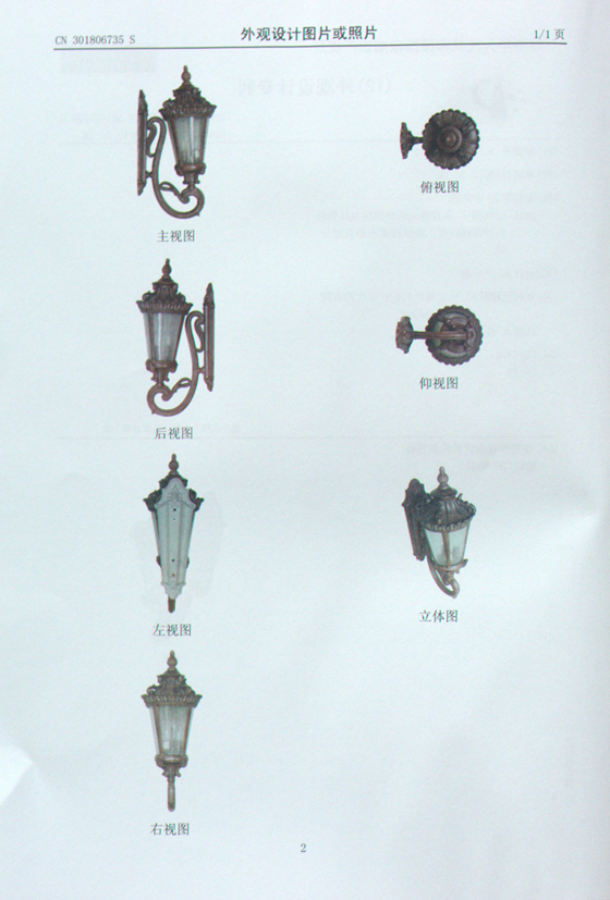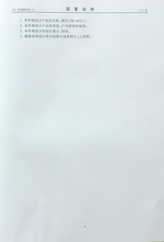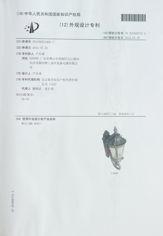 當前位置:首頁 » 資訊中心 » 帝輝燈飾獲得多項國際認證 » 帝輝燈飾壁燈4041外觀設計證書