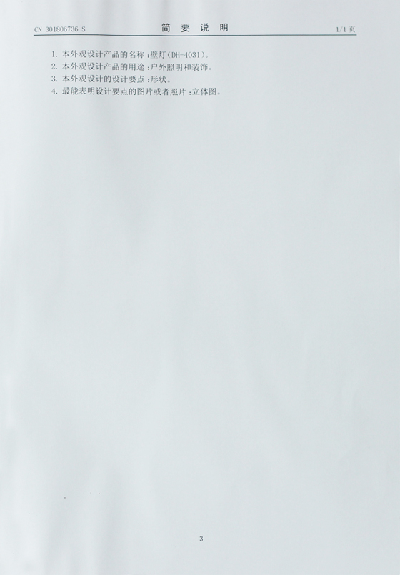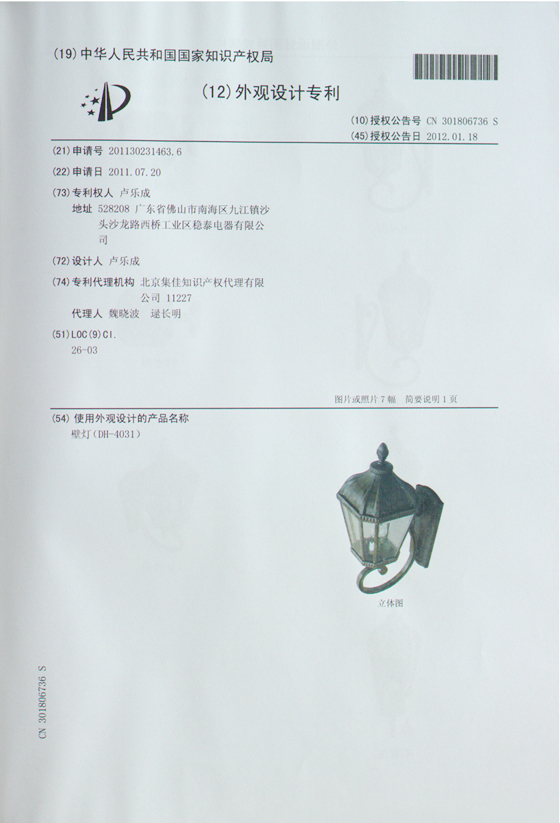 當前位置:首頁 » 資訊中心 » 帝輝燈飾獲得多項國際認證 » 帝輝燈飾壁燈外觀設計專利證書