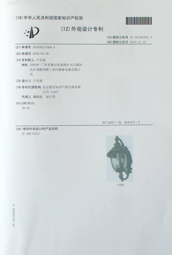 當前位置:首頁 » 資訊中心 » 帝輝燈飾獲得多項國際認證 » 帝輝燈飾產品外觀專利證書
