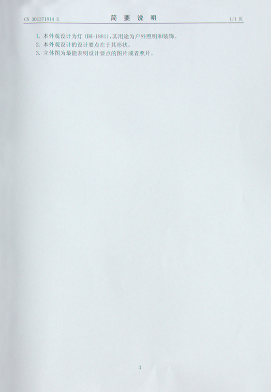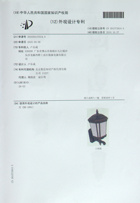 當前位置:首頁 » 資訊中心 » 帝輝燈飾獲得多項國際認證 » 帝輝燈飾外觀設計證書